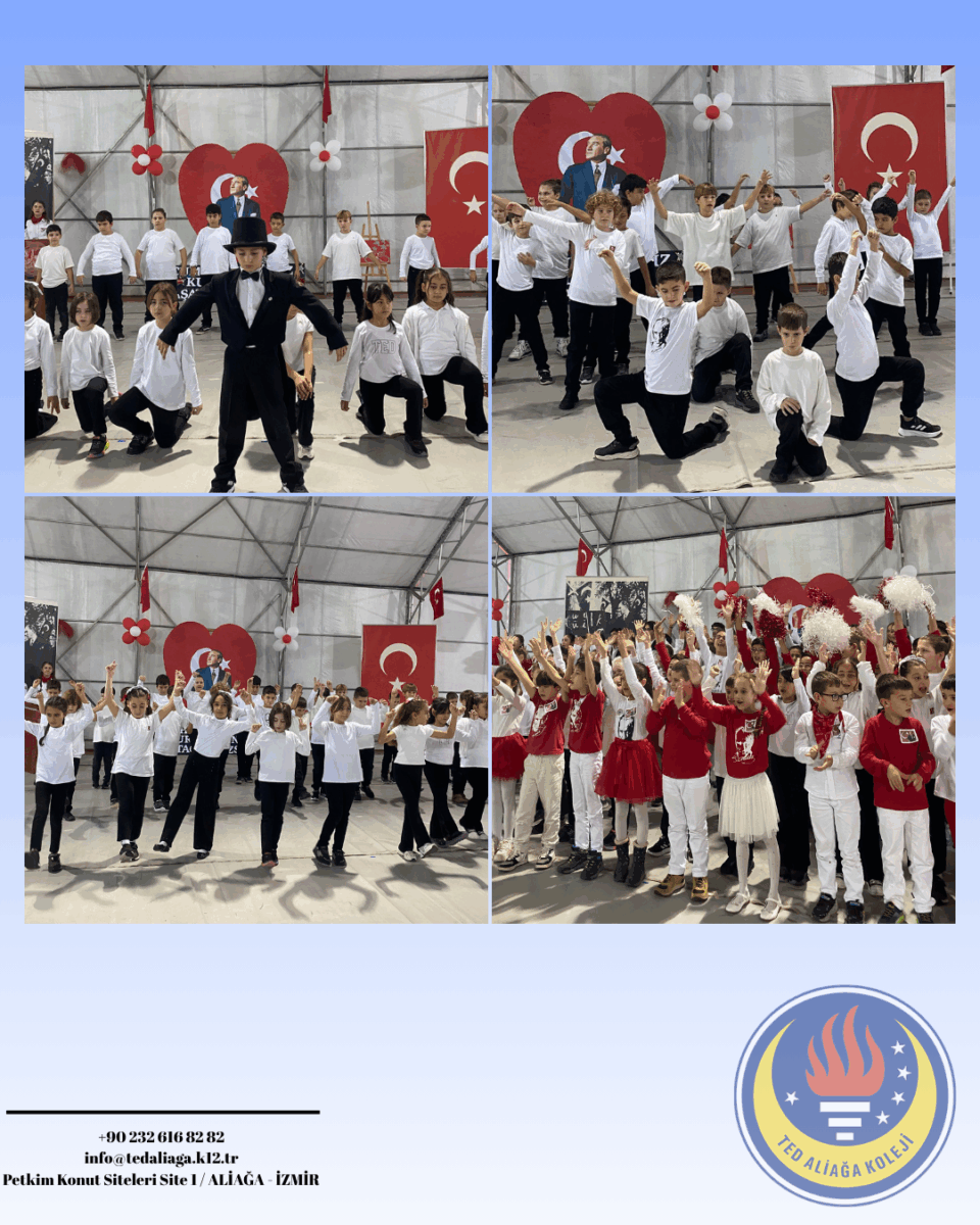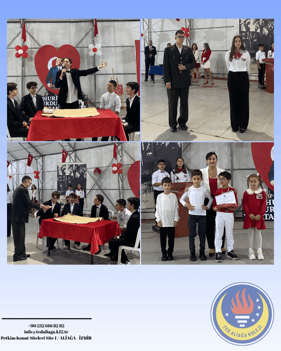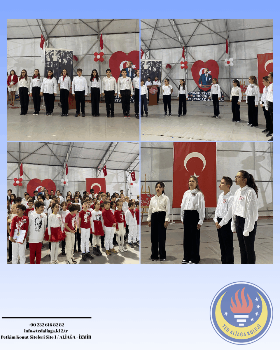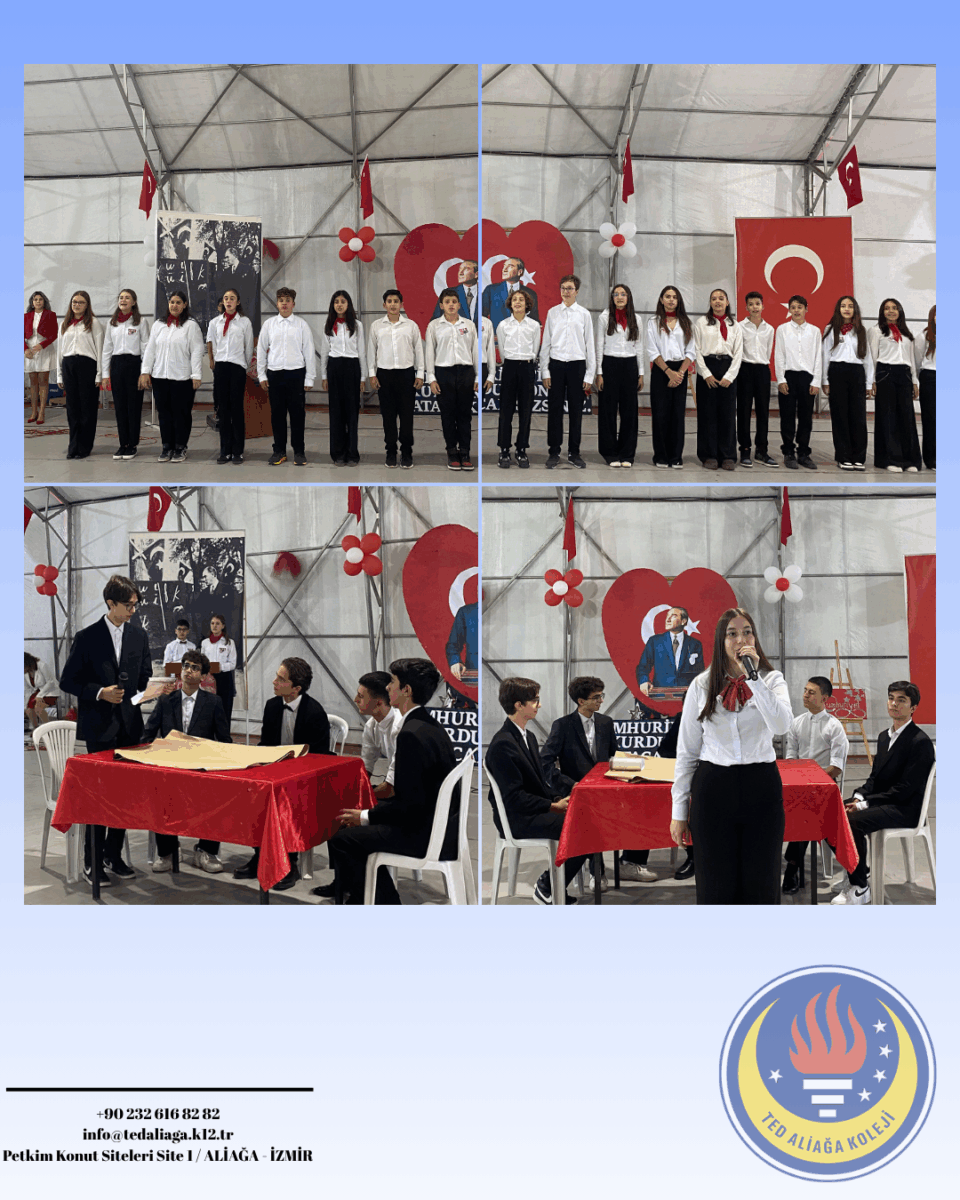 Okulumuzda düzenlenen programda öğrencilerimiz, Cumhuriyet temalı sergilerle, halk oyunlarıyla, oratoryalarıyla ve marşlarla Cumhuriyet’in anlamını bir kez daha yaşattılar.