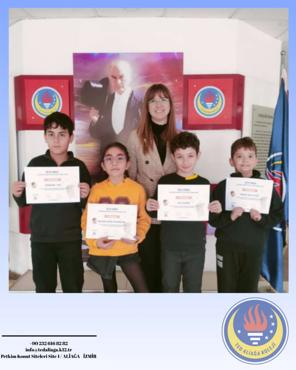 Bu kapsamda, TED Aliağa Koleji Vakfı Özel İlkokulu öğrencilerimizden; 3. sınıf öğrencisi Görkem Taş, 4. sınıf öğrencilerimiz Ata Aydın, Ömer Aras Atar ve Belgin Deniz Dağdelen, final aşamasında yarışmaya hak kazanarak bizleri gururlandırmışlardır. Öğrencilerimizi ve emeği geçen tüm öğretmenlerimizi yürekten kutluyor, başarılarının artarak devam etmesini diliyoruz.