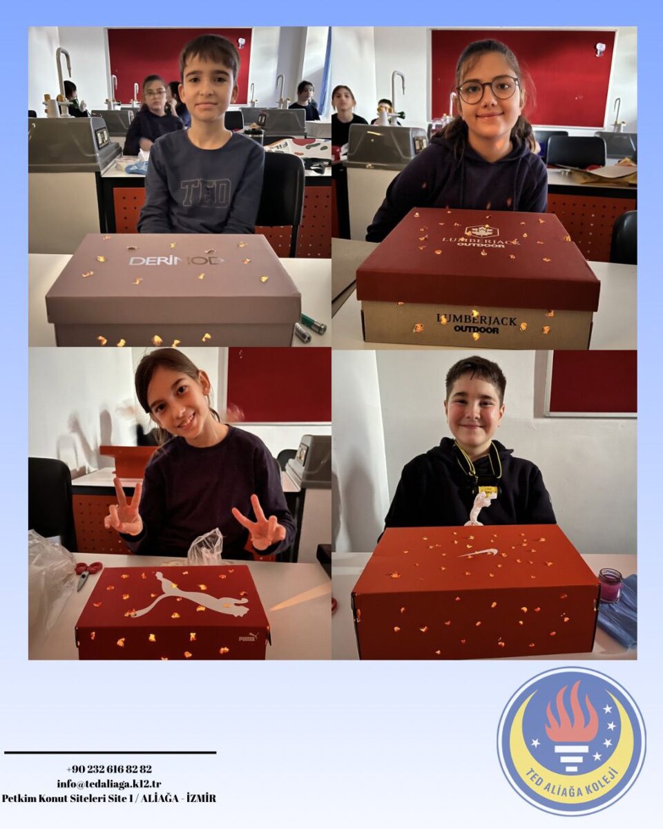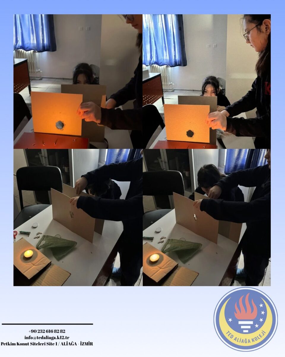 📌 Küçük delikler açtığımız kutumuzun içerisine yerleştirdiğiniz ışık kaynağından çıkan ışık ışınlarını inceleyerek ışığın her yöne yayıldığını gözlemledik.