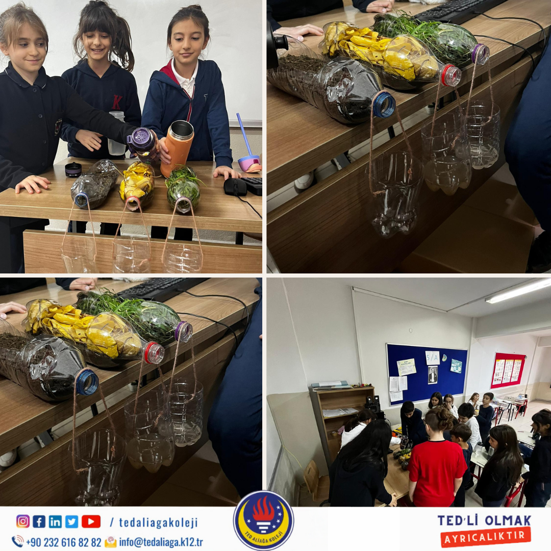 TED Aliağa Koleji Vakfı Özel Ortaokulu 5.sınıf öğrencileri Sosyal Bilgiler dersi kapsamında doğal afetlerden “EROZYON” a karşı farkındalık oluşturmak adına bir deney gerçekleştirdi.Erozyon sonucu toprağın nasıl taşındığını,toprağın taşınmasına neden olan etmenleri fark etti.