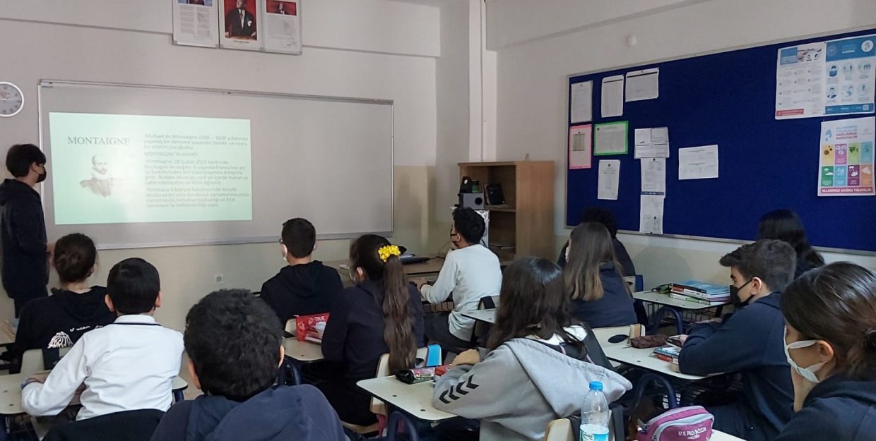 TED Aliağa Koleji 8. sınıf öğrencilerimiz, Montaigne’nin “Denemeler” adlı eseri üzerine kitap atölyesi gerçekleştirdi. Eser ve yazarla ilgili ayrıntılı bilgilerin yer aldığı sunumların sonunda atölye yöneticisi öğrencilerimiz “İnsanın başarıya ulaşması adına erdem mi, bilgi mi, akıl mı daha önemlidir?” konulu bir tartışma ortamı oluşturdu.